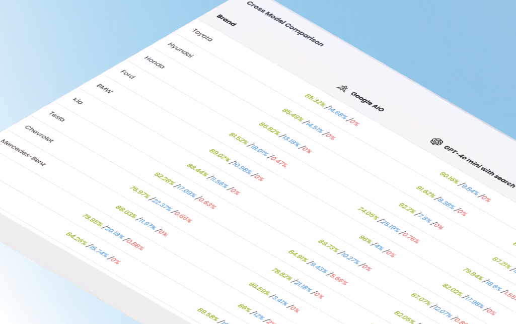 Each model favours different domains and content types. Our cross-model comparison shows how source visibility changes across ChatGPT, Gemini, Perplexity and others — allowing you to identify where you’re strong, where you’re weak, and which models reward your content.